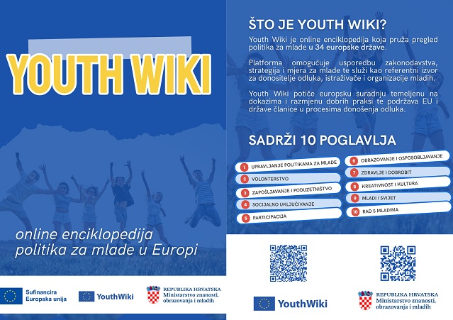 Youth Wiki je online enciklopedija koja nudi detaljan uvid u politike za mlade u 34 europske zemlje. Potiče europsku suradnju temeljenu na dokazima i vršnjačko učenje u sektoru mladih te podržava Europsku komisiju i zemlje u njihovim procesima donošenja odluka. Informacije u Youth Wikiju odražavaju ključne europske obveze i politike povezane sa Strategijom EU-a za mlade.