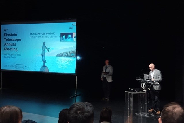 Dr. sc. Hrvoje Meštrić u svom je govoru istaknuo da su infrastrukture poput Einstein Teleskopa ključne za napredak temeljne znanosti, ali ujedno zahtijevaju inovativna rješenja. One su okosnica europskoga istraživačkog prostora i imaju presudnu ulogu u jačanju konkurentnosti Europe. Također je u naglasio važnost europskih istraživačkih infrastruktura za Republiku Hrvatsku, jer s pomoću njih jačamo izvrsnost u istraživanju, potičemo suradnju akademskoga sektora i industrije te povećavamo inovacijski potencijal zemlje.